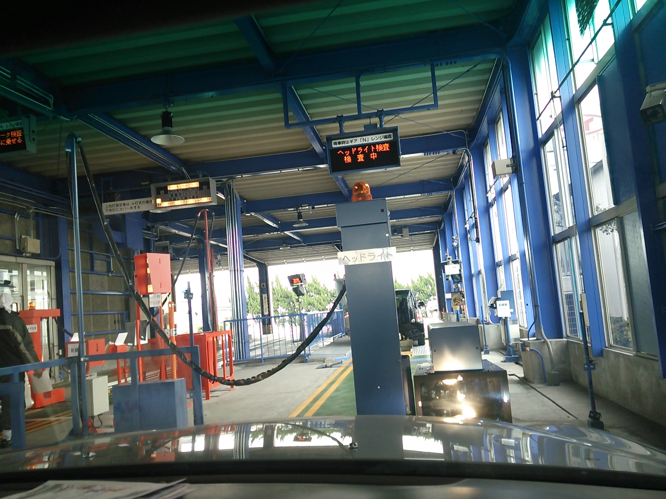 検査場によって順番ばバラバラですがここは、外装内装・ランプ類等目で確認できる保安基準の確認→サイドスリップ→スピードメーター→ブレーキ→そして画像のヘッドライト→下廻り→排気ガス→総合確認って感じで流れて行きます。